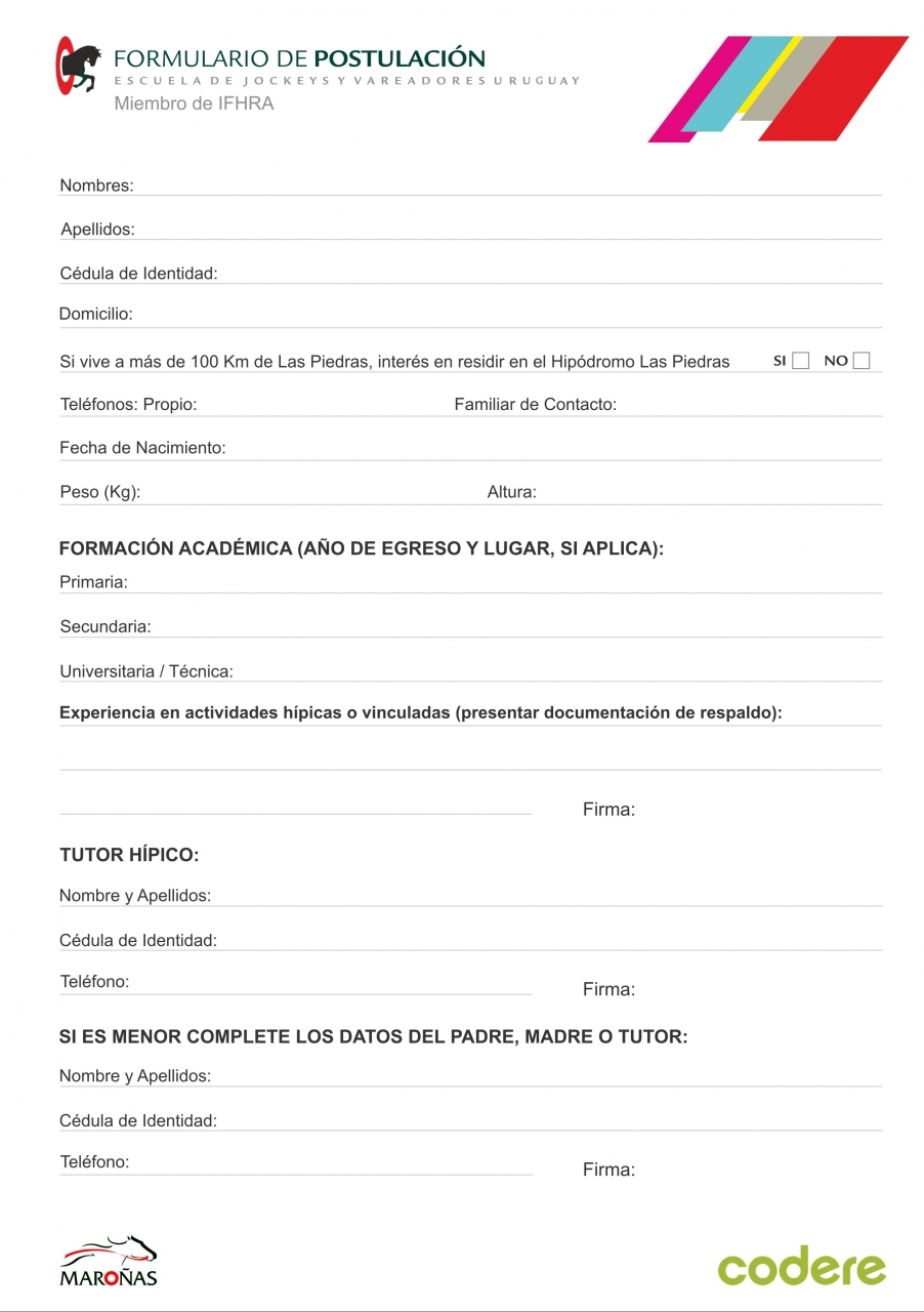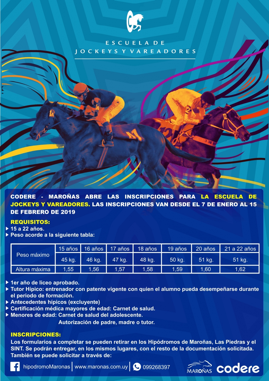 Las inscripciones van desde el 7 de enero al 15 de febrero.Los formularios a completar se pueden retirar en los hipódromos de Maroñas, Las Piedras y SINT. Se podrán entregar en los mismos lugares, con el resto de la documentación solicitada. También se podrán solicitar a través de Facebook y Whatsapp por el 099268397.